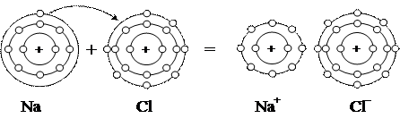 Процесс образования химического соединения ионного типа из атомов можно представить следующим образом. Сначала атомы превращаются в разноименно заряженные ионы вследствие перехода электронов от одного атома к другому, а затем уже ионы взаимно притягиваются, образуя соединение с ионной связью. Атомы натрия отдают свои «лишние» электроны, атомам хлора, превращаясь в положительные ионы с электронной конфигурацией инертного газа неона. В то же время атомы хлора, присоединившие к своему наружному слою по одному электрону, становятся отрицательными ионами со структурой атомов аргона. После этого сила электрического притяжения между разноименными зарядами связывает образовавшиеся ионы друг с другом, в результате чего получается соль – хлористый натрий (рис. 3).