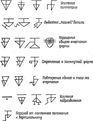 Эти образцы говорят об исключительном разнообразии реакций испытуемых, обусловленных, с одной стороны, индивидуальными различиями испытуемых, а с другой — такими факторами, как неодинаковая экспозиция рисунка и неодинаковое расстояние между предъявляемой моделью и воспринимающим субъектом. Все примеры говорят об упрощении стимулирующей модели. Я всегда восхищаюсь изобретательностью и остроумием решений, богатой образностью восприятия, которая заставляет говорить о себе даже в том случае, если эти рисунки сделаны быстро, спонтанно и лишь только с одной целью — правдоподобно зарегистрировать то, что было увидено. И хотя некоторые изображения могут быть графическим истолкованием объекта восприятия, а не описанием свойства самого объекта, тем не менее подобный эксперимент предоставляет достаточно доказательств в пользу того, что акт восприятия включает в себя решение одной определенной проблемы, а именно создание организованного целого.