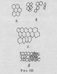 Плоскость b и изображение а на рис. 129 имеют общую пограничную линию. Установление границ — сама по себе трудная задача. На рис. 131 изображены два шестиугольника, которые стремятся отделиться друг от друга. При более специфических условиях можно действительно видеть такое отделение одной фигуры от другой. Если в течение долей секунды предъявлять расплывчатые фигуры, то управление восприятием со стороны коры головного мозга ослабевает. В результате модель, наподобие той, которая показана на рис. 132, а, иногда воспроизводится испытуемым в виде рис. 132, b, что свидетельствует о стремлении наделить каждую изобразительную единицу своим собственным контуром. В одном из экспериментов Пиаже попросил маленьких ребятишек срисовать композиции из геометрических фигур, в которых окружности или треугольники касались друг друга. В своих рисунках дети, как правило, изображали эти фигуры разобщенными. В усовершенствованном Гансом Раппом тесте для определения художественных способностей человека испытуемых просили нарисовать модель, напоминающую по своему внешнему виду восковые пчелиные соты (рис. 133,а). Чаще всего при этом изображались самостоятельные, независимые друг от друга шестиугольники и между ними оставлялось