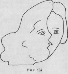 Пример, приведенный на рис. 134, взят из картины Брака. Форма линии профиля целиком изменяется в зависимости от того, к какому лицу при восприятии данного рисунка мы ее относим. То, что было пустым, становится наполненным, то, что являлось активным, становится пассивным. Примеры такого рода можно обнаружить повсюду. Некоторые художники-сюрреалисты (такие, например, как Дали) использовали технические приемы, с тем чтобы вызвать известные трюки при игре в прятки, с помощью которых на картине можно было изобразить различные, взаимно исключающие объекты. Эти композиции предназначались для того, чтобы шокировать зрителя с его благодушной верой в реальную действительность.