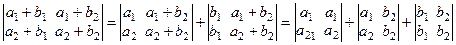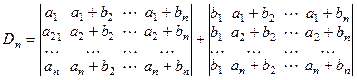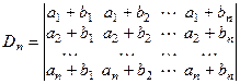 Теперь каждый из полученных определителей разложим в сумму двух определителей, воспользовавшись тем, что элементы вторых столбцов у них также представлены в виде сумм, и т.д. Проделав это, получим (n > 2), что строки полученных определителей будут такими: ai, ai, …, ai или b 1, b 2, …,bn . Строки 1го типа пропорциональны, 2го типа равны и, следовательно, все слагаемые равны нулю. Следовательно: Dn = 0 (" n > 2).