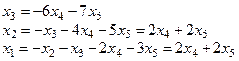 Положив х 4 = 1, х 5 = 0 Þ е 1(2, 2, –6, 1, 0). Положив х 4 = 0, х5 = 1 Þ е 2(2, 2, –7, 0, 1), (е 1, е 2– базис пространства решений). Отсюда х = (1,1,1,1,1) + a(2,2,–6,1,0) + b(2,2,–7,0,1), где a, b – любые.
