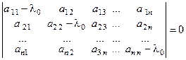 Пусть x ≠qи Aх = l0 х, т.е. x – собственный вектор оператора А, а λ0 – соответствующее ему собственное значение. Aх = l0 х тогда Aх = l0 х = (A – l0 Е) х = 0 имеем однородную систему n линейных уравнений с n неизвестными. Т.к. x ≠ q, то чтобы система имела нетривиальные решения необходимо, чтобы det(A – l0 Е) = 0:
