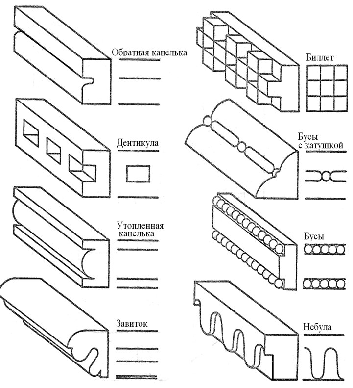 АРХИТЕКТУРНЫЙ ПРОФИЛЬ (ОБЛОМ) - любая длинная узкая плоскость с одинаковым поперечным сечением и формой профиля, создающим игру света и тени. Почти все профили возникли из деревянных прототипов классической архитектуры или каменных готических. Ныне это понятие распространяется на криволинейные очертания карнизов и прочих выступающих архитектурных деталей.