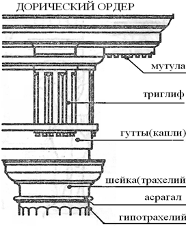 | ТРИГЛИФ – разделяющие метопы дорического фриза вертикальные плиты, как правило с двумя вертикальными желобками – глифами – на лицевой стороне и двумя фасками – полуглифами - по бокам. ТРАХЕЛИЙ – часть обвязки между гипотрахелием и капителью классической колонны. ГИПОТРАХЕЛИЙ – любая деталь между капителью и стволом классической колонны. ГУТТА – небольшая декоративная деталь в виде нависшей капли на обращенных книзу поверхностях мутул и регул дорического антаблемента. |