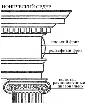 ИОНИЧЕСКИЙ ОРДЕР – каннелированные колонны обычно стоят на профилированных базах, неся антаблемент, который состоит из архитрава с тремя фасциями, богато декорированного фриза с выступающим пояском из остроконечных деталей и зубчиков.