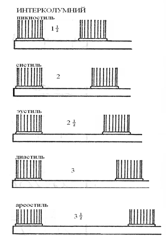 | ПИКНОСТИЛЬ Интерколумний в полтора диаметра. СИСТИЛЬ Интерколумний в два диаметра. ЭУСТИЛЬ Интерколумний от два с четвертью диаметра. ДИАСТИЛЬ Интерколумний в три диаметра. АРЕОСТИЛЬ Интерколумний от трех с половиной до четырех диаметров. |