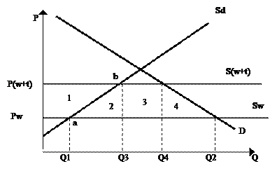В результате импорт сократится до [Q3Q4], а собственные производители увеличивают выпуск на [Q1Q3]. Потребители столкнутся с ситуацией возрастания цены с Pw до P(w + t). В результате сократится потребительский излишек на (1+2+3+4), т.е. потребители окажутся в проигрыше.