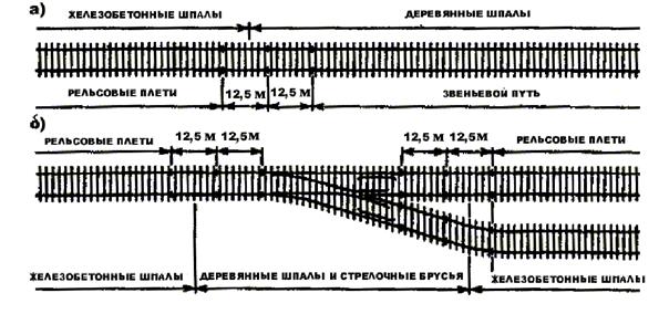 Рисунок 2.1 Схемы примыкания бесстыкового пути на железобетонных шпалах к звеньевому пути (а) и к стрелочному переводу (б)