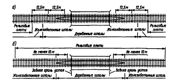 Рисунок 2.2. Схемы расположения железобетонных и деревянных шпал при примыкании рельсовых плетей к мостам (а) и при перекрытии мостов рельсовыми плетями (б)