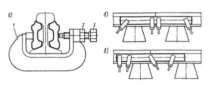 Рисунок 4.7 Струбцина по проекту ПТКБ ЦП (а) и схемы установки струбцин при изломе между шпалами (б)