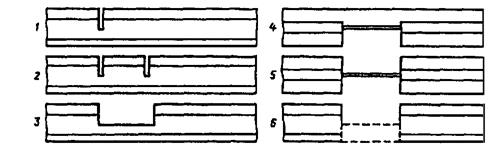 1-3 - расположение резов при виде сбоку; 4-5 - расположение резов в плане; 6 - последовательно выжигаемая часть шейки рельса (обозначена пунктирной линией)
