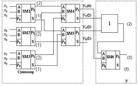 Приведем пример синтеза пороговой схемы (6/9). На рис. 6.1 показана эта схема, реализованная на 6 одноразрядных сумматорах и одном ЛЭ ИЛИ. Если на вход сумматора подается переменная, имеющая вес 2m , то выход суммы имеет также вес 2m , а перенос – вес 2m+1. На все три входа сумматора можно подавать только переменные, имеющие одинаковые веса. С помощью сумматоров SM1-SM5 производится обычное сложение двоичных чисел. Выходными сигналами этой части являются сигналы yj, j=0,1,2,3. Так как L=6 – четное число, то переменная y0, имеющая вес 1, не может оказать влияние на превышение суммой переменных xM (m=1,2,3,4,5,6,7,8,9) порога L, т.е. эту переменную можно исключить из дальнейшего рассмотрения. Таким образом, остались три переменные: y1 - переменная, имеющая вес 4, и переменные y2 и y3 имеющие вес 2.