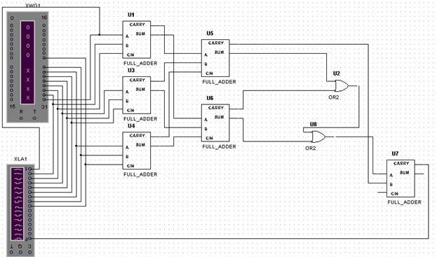 Схема сумматора должна иметь столько выходов, чтобы можно было закодировать число М. В рассматриваемом примере М = 9, значит, сумматор должен иметь 4 выхода. Для выполнения этого условия необходимо взять 5 одноразрядных сумматоров, где выход переполнения схемы сумматора является старшим разрядом дешифрируемого числа L, т.е. имеет вес = 4. Далее нам необходимо построить КС чтобы выявить число L = 5.