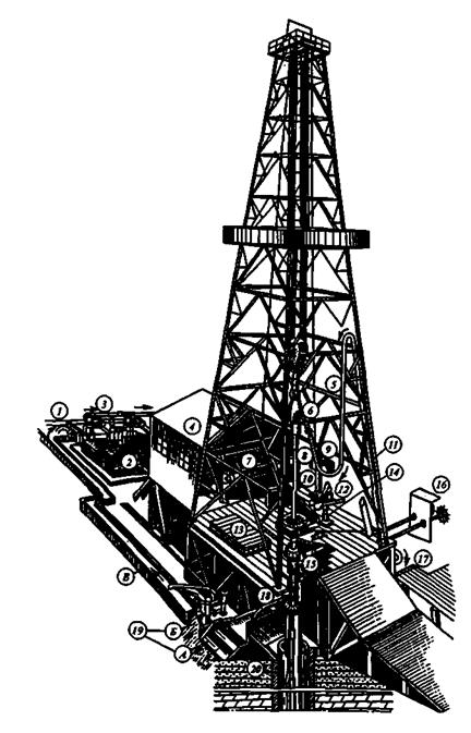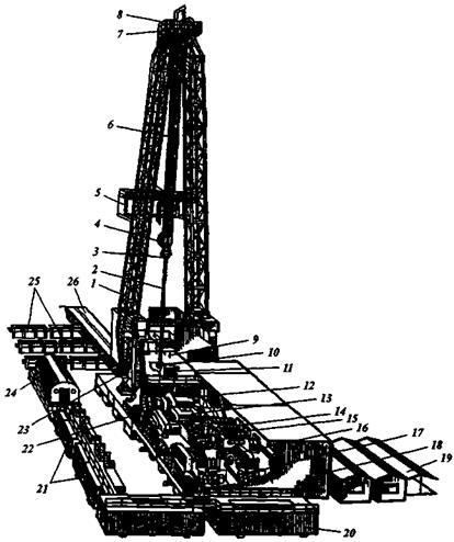 1 - секция мачты; 2 - бурильная колонна; 3 - элеватор; 4 - талевый блок; 5 -полати; 6 - талевый канат; 7 - верхняя площадка; 8 - кронблок; 9 - подсвечник; 10 - ротор; 11, 12 - вспомогательная и главная лебедки; 13 - коробка передач; 14 - двигатели; 15 - трансмиссия двигателей; 16 - трансмиссия бурового насоса; 17 - буровые насосы; 18 - укрытие приводного и насосного комплексов; 19 - бытовые помещения; 20, 21 - приемный и промежуточный баки; 22, 23 - основания силового привода и подроторное; 24 - блок очистки раствора; 25 - стеллажи для труб; 26 - мостки