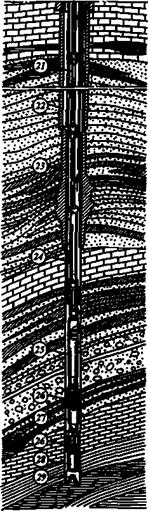 1 - приемная емкость; 2 - буровые насосы; 3 - нагнетательная линия; 4 - силовой блок; 5 - буровой рукав; 6 - вертлюг, 7 - лебедка; 8 - ведущая труба; 9 -индикатор веса; 10 - машинные ключи; 11 - стояк; 12 - ключ АКБ-ЗМ2; 13 -подсвечник; 14 - ротор; 15 - превентор; 16 - ручной привод превентора; 17 - трубный стеллаж; 18 - выход раствора в желоб; 19 - блок очистки раствора (А - вибросито; Б - гидроциклоны; В - желобная система); 20 - кондуктор; 21 - бурильная колонна; 22, 23 - 1-я и 2-я промежуточные колонны соответственно; 24 - утяжеленные бурильные трубы; 25 - турбобур; 26 - калибратор; 27 - маховик; 28 - переводник; 29 - долото