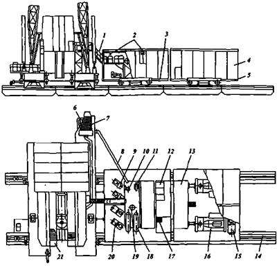 1 - переход; 2 - балка грузоподъемного механизма; 3 - основание блоков резервуаров; 4 - укрытие; 5 - основание насосного блока; 6 - кронштейн; 7 - вибросита; 8 ~ трубопровод; 9 - шламовый насос; 10 - гидроциклон; 11 - илоотделитель; 12 - дозировочная емкость; 13 - резервуар; 14 - направляющая; 15 - электропривод бурового насоса; 16 ~ буровой насос; 17 - гидромешалка; 18 - ресивер; 19 - воздухоосушка; 20 - компрессорная станция; 21 - вышечно-лебедочный блок