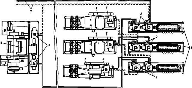 1 - ДВС приводов генераторов постоянного тока; 2 - генераторы постоянного тока; 3 - электродвигатели; 4 - буровые насосы; 5 - вспомогательный насос; 6 - лебедка; 7 - линия питания электроэнергией (сплошные линии - подъем колонны; штриховые линии - бурение)