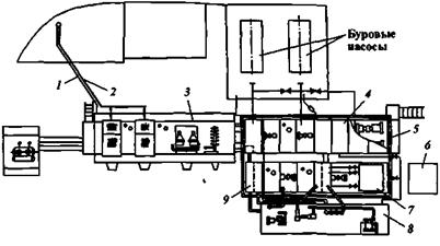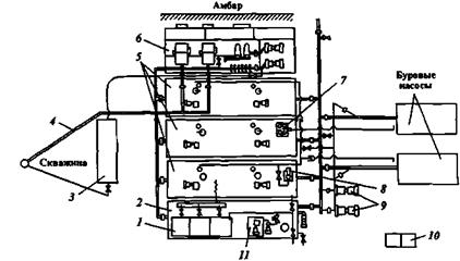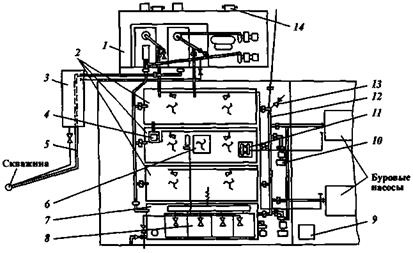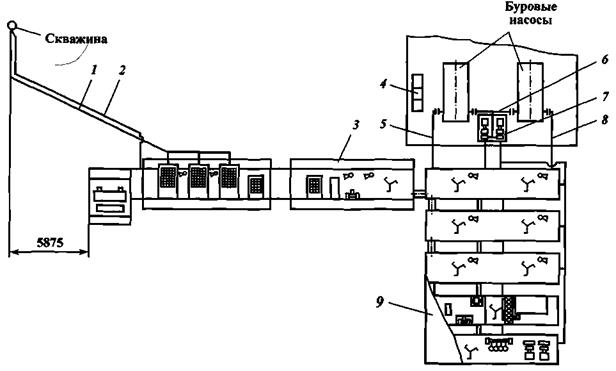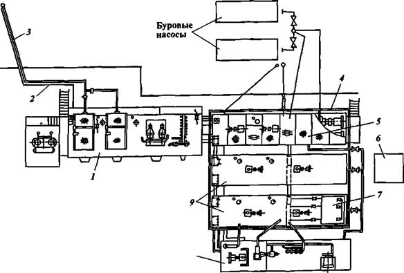 1 - трубопровод долива; 2 - растворопровод; 3 - блок очистки; 4 - приемный блок; 5 - укрытие; 6 - блок распределительного устройства; 7 - резервуар химических реагентов; 8 - блок приготовления и обработки бурового раствора; 9 - промежуточный блок