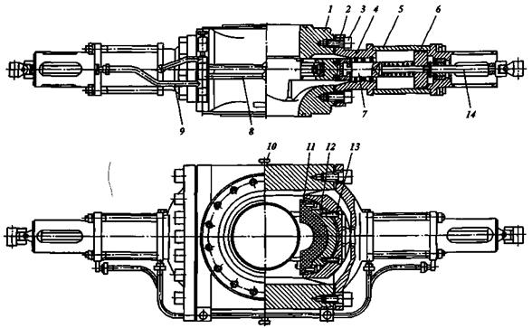1 - корпус; 2 - резиновые прокладки; 3 - винты; 4 - откидные крышки; 5 - гидроцилиндр; 6 - поршень; 7 - шток; 5 - коллектор; 9 - трубопровод; 10 - паропроводы; 11 - резиновые уплотнения плашек; 12 - сменные вкладыши; 13 - корпус плашки; 14 - фиксирующий винт