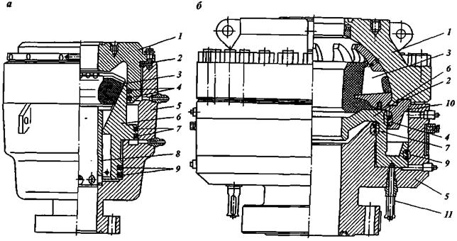 а - типа ПУ1; 6 - типа ПУ2; 1 - крышка; 2 - уплотнение крышки; 3 - уплотнитель; 4,7,9- манжеты; 5 - корпус превентора; 6 - плунжер; 8 - втулка; 10 - планшайба; 11 - указатель положения уплотнителя