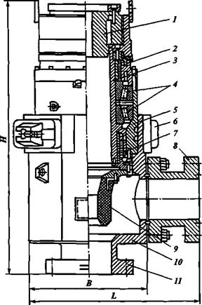 1 - вкладыш; 2, 7 - уплотнения; 3 - ствол; 4 - роликоподшипники радиально-упорные; 5 - корпус съемного патрона; 6 - байонетная гайка; 8 - боковой отвод с фланцем; 9 - уплотнитель герметизатора; 10 - корпус герметизатора; 11 - присоединительный фланец