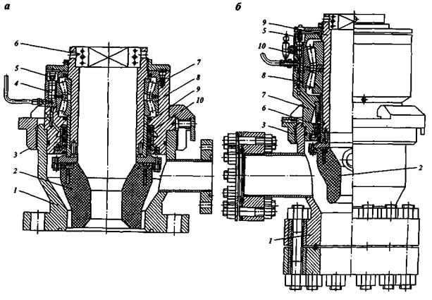 а - типов ПВ1-С-(280, 350, 425)х7; б - типа ПВ6-С-280х14; 1 - корпус; 2 - элемент уплотнительный; 3 - гайка байонетная; 4 - насос; 5 - привод насоса; 6 - вкладыш ведущей трубы; 7 - корпус патрона; 8 - узел подшипников; 9 - ствол вращающийся; 10 - узел шевронного уплотнения.