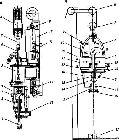 а - вид сборку; б - вид спереди; 1 - штропы элеватора; 2 - гидроцилиндры; 3 -трубный манипулятор; 4 - вертлюжная головка; 5 - вертлюг редуктор; б - штропы вертлюга-редуктора; 7 - система разгрузки резьбы; Я - талевая система; 9 -дискоколодочный тормоз; 10 - электродвигатель постоянного тока; 11 - рама с роликами (каретка); 12 - блок роликов; 13 - трубный зажим; 14 - ниппель; 15 -шаровой кран; 16 - отвод штропов элеватора; 17 - стопорное устройство; 18 - направляющие мачты; 19 - гидродвигатель; 20 - траверса вертлюжной головки; 21 - элеватор; 22 - клиновой захват.