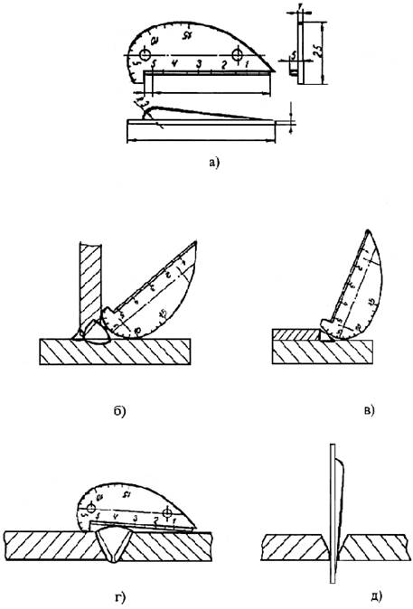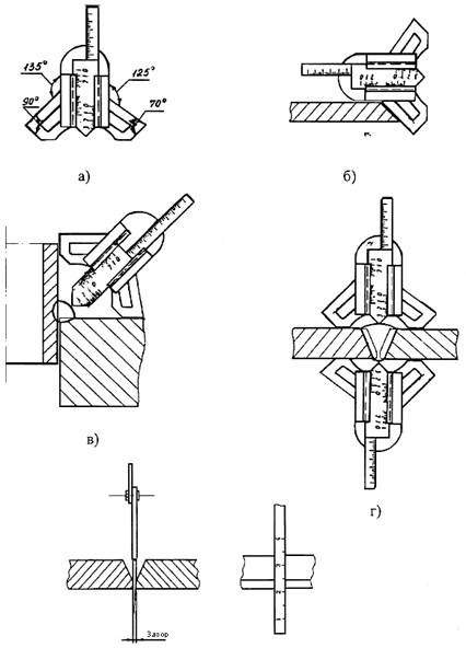 а) общий вид шаблона; б), в), г) контроль стыковых, тавровых и нахлесточных сварных соединений; д) измерение зазора между кромками