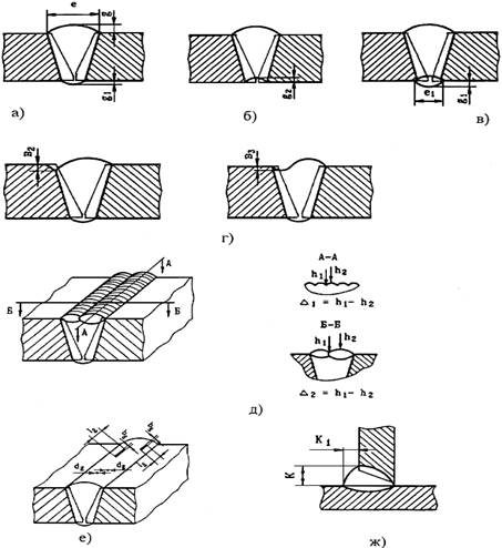 а), б) размеры (ширина, высота) стыкового одностороннего шва с наружной и внутренней стороны; в) то же двухстороннего сварного шва; г) подрез и неполное заполнение разделки кромок; д) чешуйчатость (D1) шва и западание между валиками шва (D2); е) размеры поверхностных включений (диаметр - dg; длина - lg; ширина - bg включения); ж) размеры катета шва углового (таврового, нахлесточного) соединения