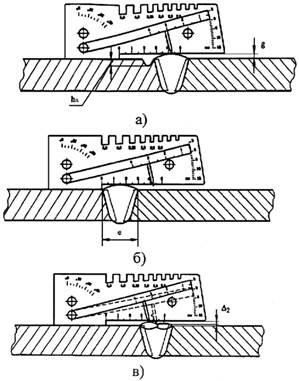 а) измерение высоты шва (g) и глубины подреза (h п); б) измерение ширины шва (е);