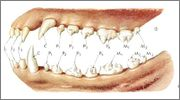 Схема полного набора зубов верхней (справа) и нижней (слева) челюстей собаки