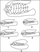 Замена резцов начинается после 3 месяцев, но чаще на 4-м или даже 5-м месяце. Первоначально выпадают внутренние резцы, т. е. I’i, затем следуют средние резцы ig, на 5-м месяце заменяются боковые резцы («з. Молочные клыки с обычно заменяются постоянными клыками С на 6-м месяце. На этом заканчивается замена передней группы зубов. Молочные премоляры вырастают в период между 4—8-й неделями, за исключением Pi, который обычно вырастает в 5—6-месячном возрасте собаки. Р)—первый коренной зуб вырастает только 1 раз—постоянный зуб. Было бы правильно обозначать его сразу как Р\, но при оценке набора молочных зубов уже укоренилось в практике обозначение его р\. Моляры, задние коренные зубы, вырастают только раз и, следовательно, уже не меняются. Они должны вырасти к концу 7-го месяца. Молочные зубы начинают выпадать с ростом постоянных, которые постепенно растут и при этом давят на корни молочных зубов. Зубы вследствие этого давления расшатываются и в конце концов выпадают.