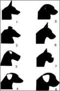 Уши различают по форме, величине и поставу. Сочетание этих и других признаков придает определенный облик голове собаки, характерный той или иной породе. Форма ушей большинства пород напоминает равнобедренный треугольник. Концы ушей могут быть заостренные или закругленные. Уши относительно величины головы бывают большие и маленькие, длинные и короткие, а также стоячие, полустоячие и висячие.