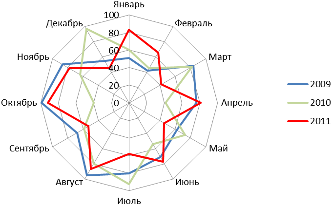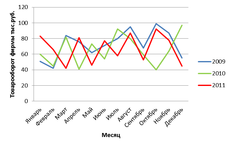 Рисунок 1 – Данные о товарообороте торговой фирмы за 2009-2011 гг.
