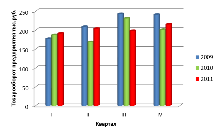 Рисунок 3 – Товарооборот торговой фирмы по кварталам за 2009-2011 гг.