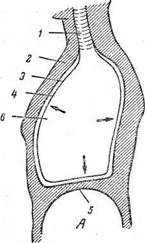 1—трахея; 2 —стенка грудной клетки; 3 —плевральная полость; 4 —висцеральная плевра; 5—диафрагма; б—легкое; 7—плевральная полость при пневмотораксе; 8 —шварты;