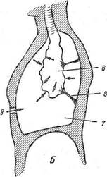 Рис. 32. Положение легкого в норме (А) и при пневмотораксе (Б)(схема).