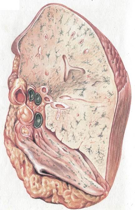 Рис. 33. Крупозная пневмония, серое опеченение верхней доли легкого