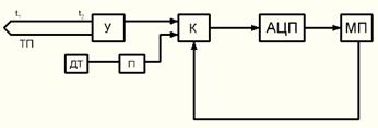 объекта (технологического процесса) и преобразует ее в термоЭДС. Датчик температуры (терморезистор) измеряет температуру свободных концов термопары, изменяя свое электрическое сопротивление. Коммутатор по сигналу микропроцессора сначала подключает на вход АЦП сигнал термопары - термоЭДС, АЦП преобразует ее в цифровой код и направляет в микропроцессор. Затем микропроцессор подает сигнал коммутатору о подключении датчика температуры (терморезистора). Изменение сопротивления терморезистора преобразуется в напряжение с помощью преобразователя П, затем АЦП преобразует это напряжение в цифровой код, который подается в микропроцессор. Вычитая из первого цифрового кода второй, микропроцессор делает коррекцию и выдает реальную температуру объекта.