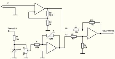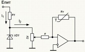 Элементы схемы R1, R2 и VD1 представляют собой стабилизированный источник напряжения на стабилитроне VD1. Rт – терморезистор. Напряжение питания схемы 15 В.