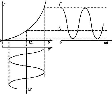 Вследствие нелинейности характеристики форма тока на выходе становится несинусоидальной. Причину этого искажения гармонического колебания можно пояснить следующим образом.