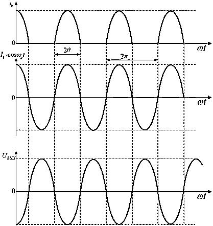 . Положим, что коллекторный ток транзистора имеет форму косинусоидальных импульсов с отсечкой. Временн ы е диаграммы импульсов коллекторного тока