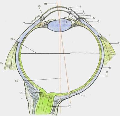 1 —cornea; 2 — camera anterior bulbi; 3—lens; 4 — iris; 5 — camera posterior bulbi; 6 — conjuctiva; 7 — m. rectus lateralis; 8 — sclera; 9 — choroidea; 10— retina; 11 — fovea centralis; 12 — n. opticus; 13 —excavatio disci; 14 — axis bulbi externus; 15 — m. rectus medialis; 16 — поперечная ось глазного яблока; 17 corpus ciliare; 18 — zonula ciliafis; 19—axis opticus.