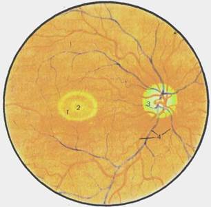 1 — macula; 2 fovca contrails; 3 — discus n. optici; 4 — кровеносные сосуды.