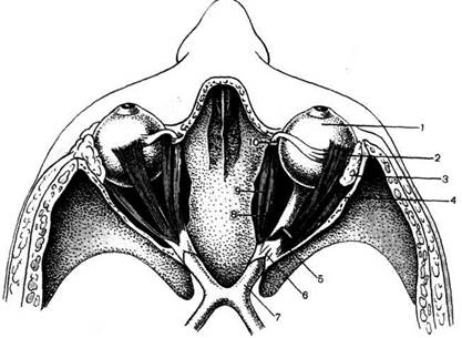 Между влага-лищем глазного яблока и надкостницей глазницы, вокруг глазодвигательных мышц и зрительного нерва залегает пронизанная соединительнотканными перемычками жировая ткань — жировое тело глазницы, corpus adiposum orbitae, выполняющее роль эластичной подушки для глазного яблока. Спереди глазница с ее содержимым частично закрыта глазничной перегородкой, septum orbitdle, берущей начало от надкостницы верхнего и нижнего краев глазницы и прикрепляющейся к хрящам верхнего и нижнего века, а в области внутреннего угла глаза соединяющейся с медиальной связкой века. Глазничная