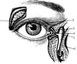 1 — gl. lacrimalis; 2 — palpebra superior; 3 — сапа-liculus lacrimalis; 4 — lacus lacrimalis; 5 — saccus lacrimalis; 6 — ductus nasolacri-malis.