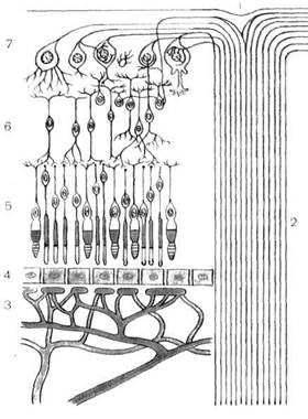 Рис. 207. Строение сетчатки глаза (схема). I — углубление диска; 2 — нервные волокна (отростки ганглиозных клеток); 3 — кровеносные сосуды собственно сосудистой оболочки; 4 — пигментный слой; 5 — слой колбочковидных и палочковидных зрительных клеток; 6 — слой биполярных нейроцитов; 7 — гангли-озный слой (ганглиозные клетки).