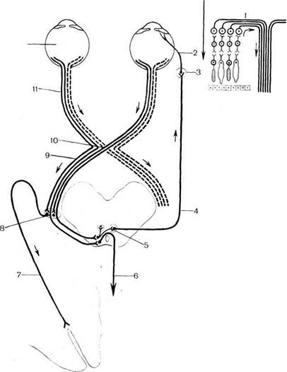 1 — строение сетчатки и формирование зрительного нерва (длинной стрелкой показано направление прохождения света в сетчатке); 2— nn. ciliares breves; 3 — gangl. ciliare; 4 — n. oculomotorius; 5 — nucl. ocu-lomotorius accessorius [autono-micus]; 6 — tr. tectospinalis; 7 — radiatio optica; 8 — corpus ge-niculatum laterale; 9 — tr. opti-cus; 10 — chiasma opticum; 11 — n. opticus; 12 —bulbus oculi. Короткие стрелки показывают направление движения нервных импульсов.
