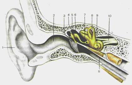 Рис. 208. Преддверно-улитковый орган, orga-пит vestibulocochleare. 1 — auricula; 2 — mea-tus acusticus externus; 3 — membrana tympani [tympani-ca]; 4 — cavitas tympanica; 5 — malleus; 6— incus; 7 — stapes; 8 — vestibulum; 9 — cochlea; 10—n. vestibulo-cochlearis; 11 — tuba audi-tiva.